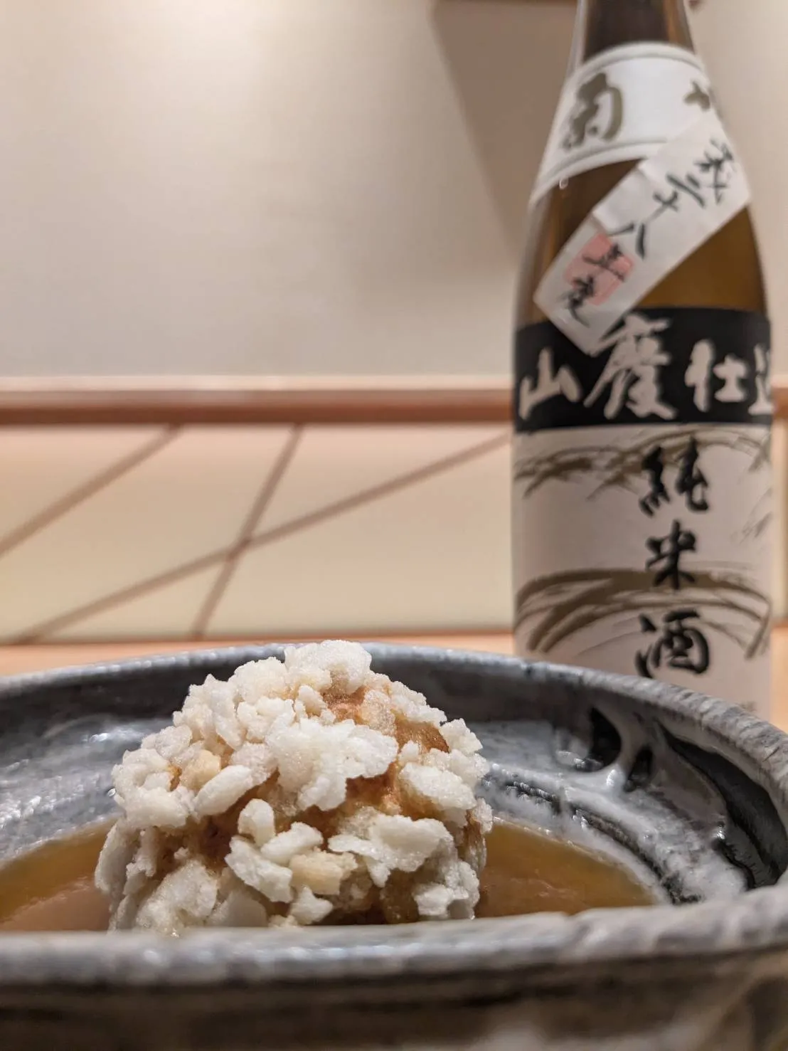 - 春薫る熟じゃが饅頭おかき揚げ 熊ミンチ射込み 新玉葱摺り流し餡